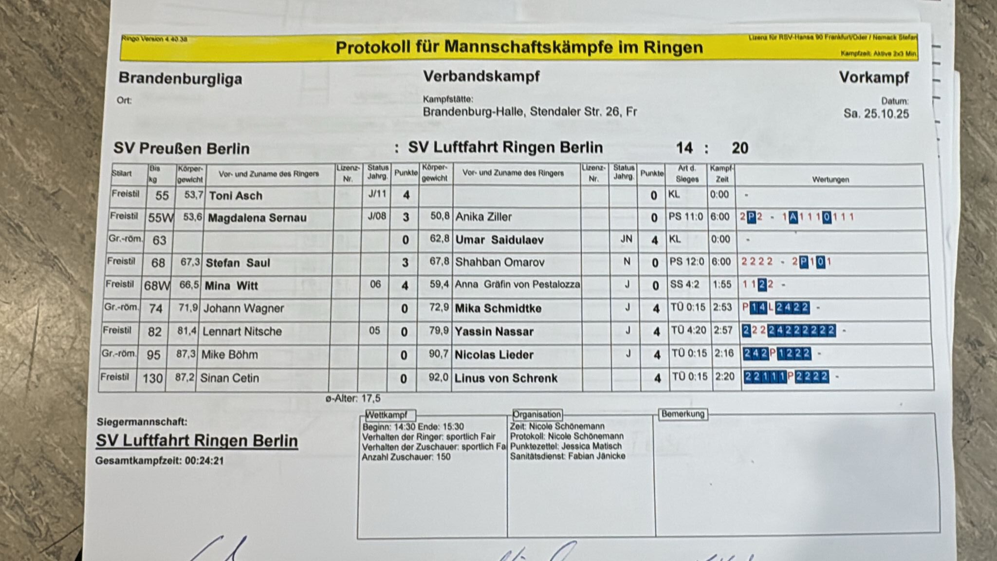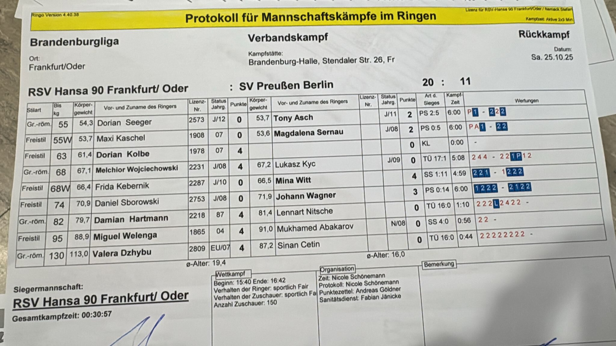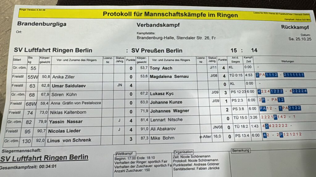 Am 25.10.2025 fand für den SV Preußen in Frankfurt/Oder der letzte Kampftag in der Brandenburgliga statt. Mit 3 Mannschaftskämpfen gegen den RSV Hansa 90 Frankfurt/Oder (Rückkampf) und gegen den SV Luftfahrt Berlin (Hin-,und Rückkampf) verabschiedete sich der SV Preußen von dieser diesjährigen Brandenburgliga. Unser junges Team verkaufte sich sehr gut und es kam zu packenden und sehr spannenden knappen Kämpfen. Der Hinkampf gegen den SV Luftfahrt Berlin endete 14:20 für den SV Luftfahrt. Der Rückkampf gegen den RSV Hansa 90 Frankfurt/Oder endete 20:11 für Frankfurt/Oder und der Rückkampf gegen den SV Luftfahrt ging ganz knapp an die Luftfahrter mit 15:14. Herzlichen Glückwunsch von der gesamten Abteilung Ringen des SV Preußen Berlin für die gesamte Mannschaftsleistung in der Brandenburgliga 2025.