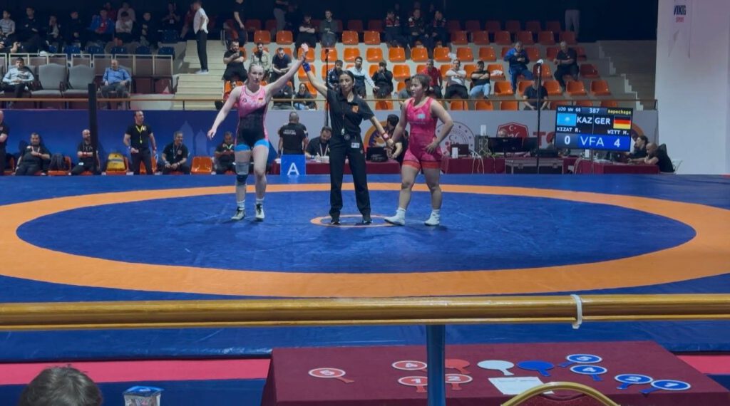 Vom 17.04. – 19.04.2026 war auch unsere amtierende Deutsche Meisterin Mina Witt mit der Nationalmannschaft zu einem Internationalen Turnier der U20 in Antalya/Türkei unterwegs, was ebenfalls vom Bundestrainer als Qualifikationsturnier für die kommende Europameisterschaft ausgelobt wurde. In der Gewichtsklasse bis 68 Kg bezwang Mina ihre erste Gegnerin im 1/8 Finale Maja Munk (HUN) mit 6 zu 4 . Der zweite Kampf im 1/4 Finale war leider erfolglos gegen Elif Sevval Kurt (Türkei). Da die Gegnerin ins Finale einzog , kämpfte Mina erneut in der Hoffnungsrunde und siegte gegen Rukhkhiia Kizat (KAZ) vorzeitig nach 1:06 Minute. Somit rang Mina im Kampf um Bronze gegen Evangeliia BEREZHNOVA (RUS). Der Kampf endete für die Russin und Mina erkämpfte einen tollen 5. Platz.